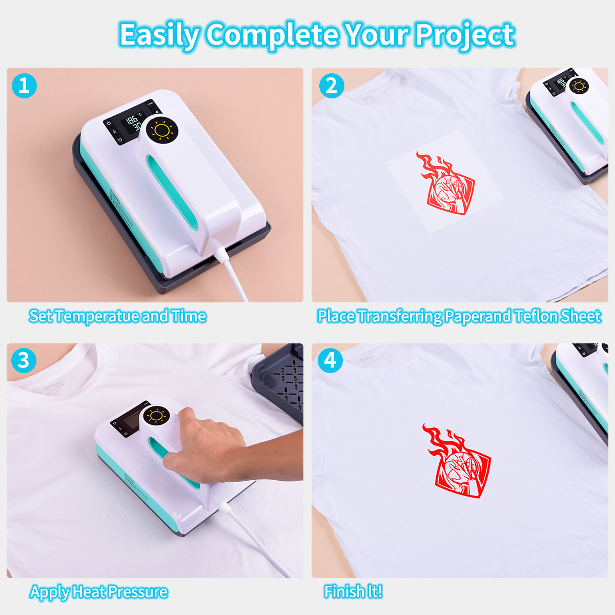 a.最高温度400°F (205°C),适用于不同HTV材料; b.通过UL电源线,安全可靠; c.选用优质热敏烫头,高温保护; d.升温速度快,达到温度按键颜色切换提示; e.10分钟静置关机功能; f.隔热垫适用耐高温材料,迅速降温。